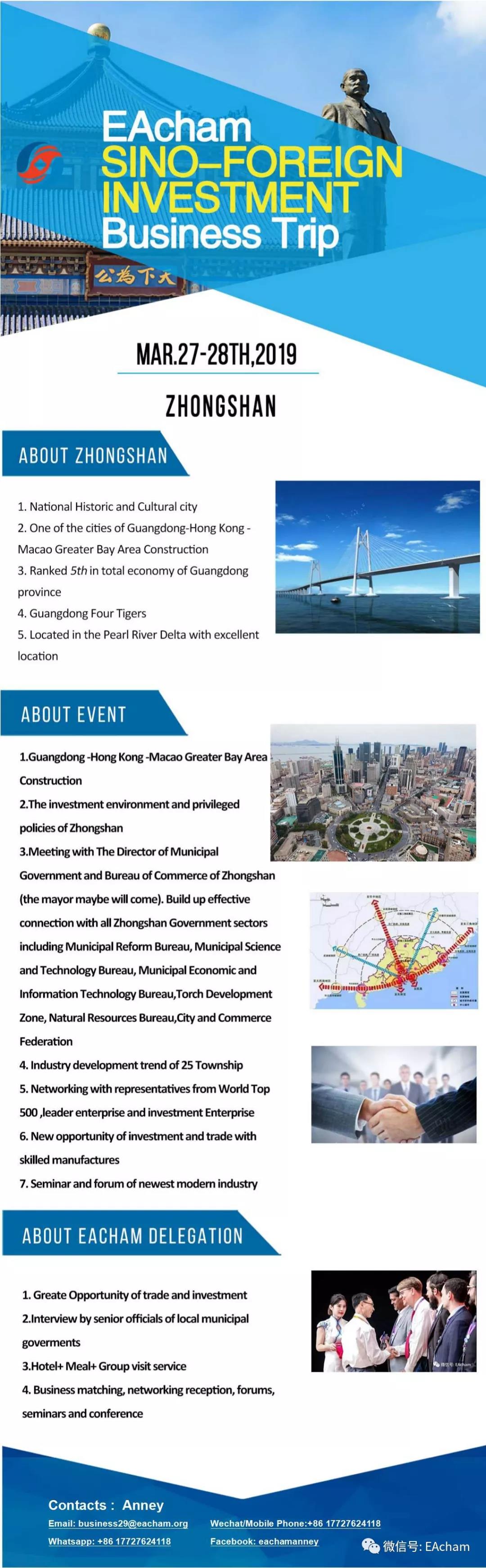 On March 27th -28th,2019,EAcham will organzie one Invesment Delegation to Zhongshan Trade and Invesment Fair (hosted by Municipal Government and Bureau of Commerce of Zhongshan City) ,the member of EAcham Investment delegation including SCHNEIDER ELECTRIC , IBM, Kerman Group etc,and Kerman Group are looking for the automotive industry partner .